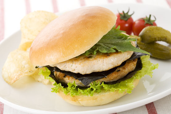 ●バンズ 1個 ●海苔 適量 ●鶏ひき肉 50g ●ショウガ 1/3かけ ●醤油 小さじ1 ●コショウ 少々 ●グリーンカールまたは レタス 適量